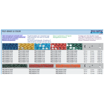 Cabo trenzado pre-estirado con alma de poliéster y funda exterior de poliéster de 32 cordones. Mínimo estiramiento.